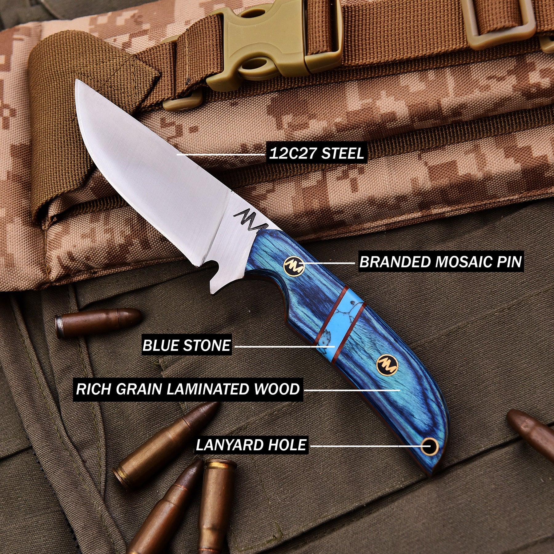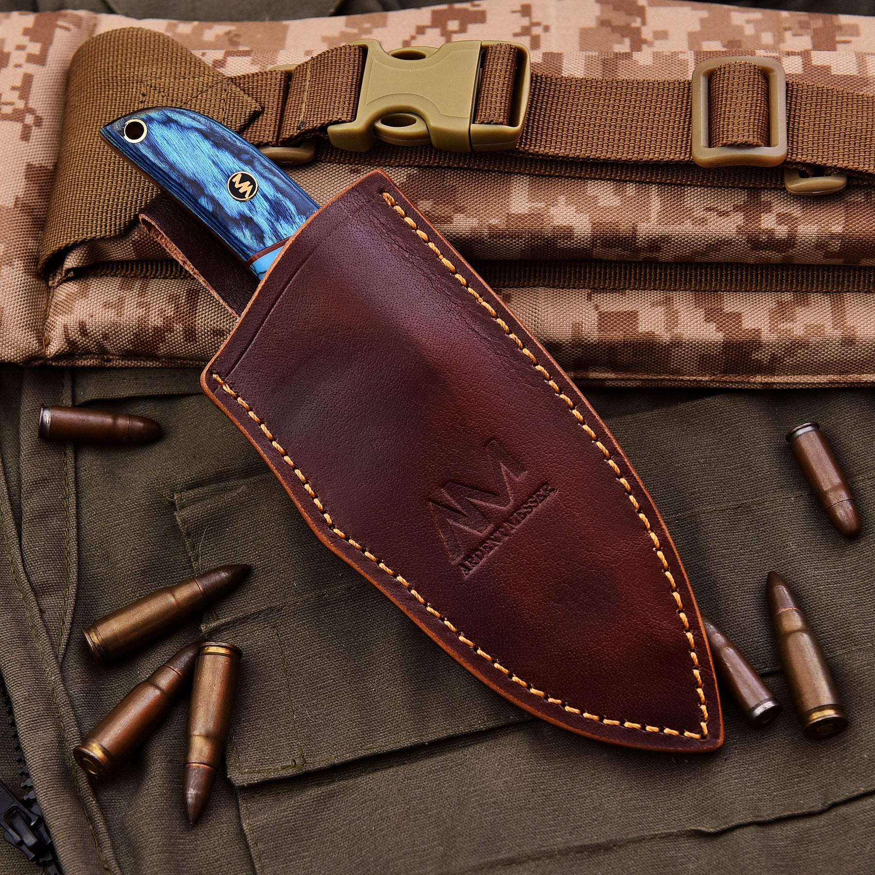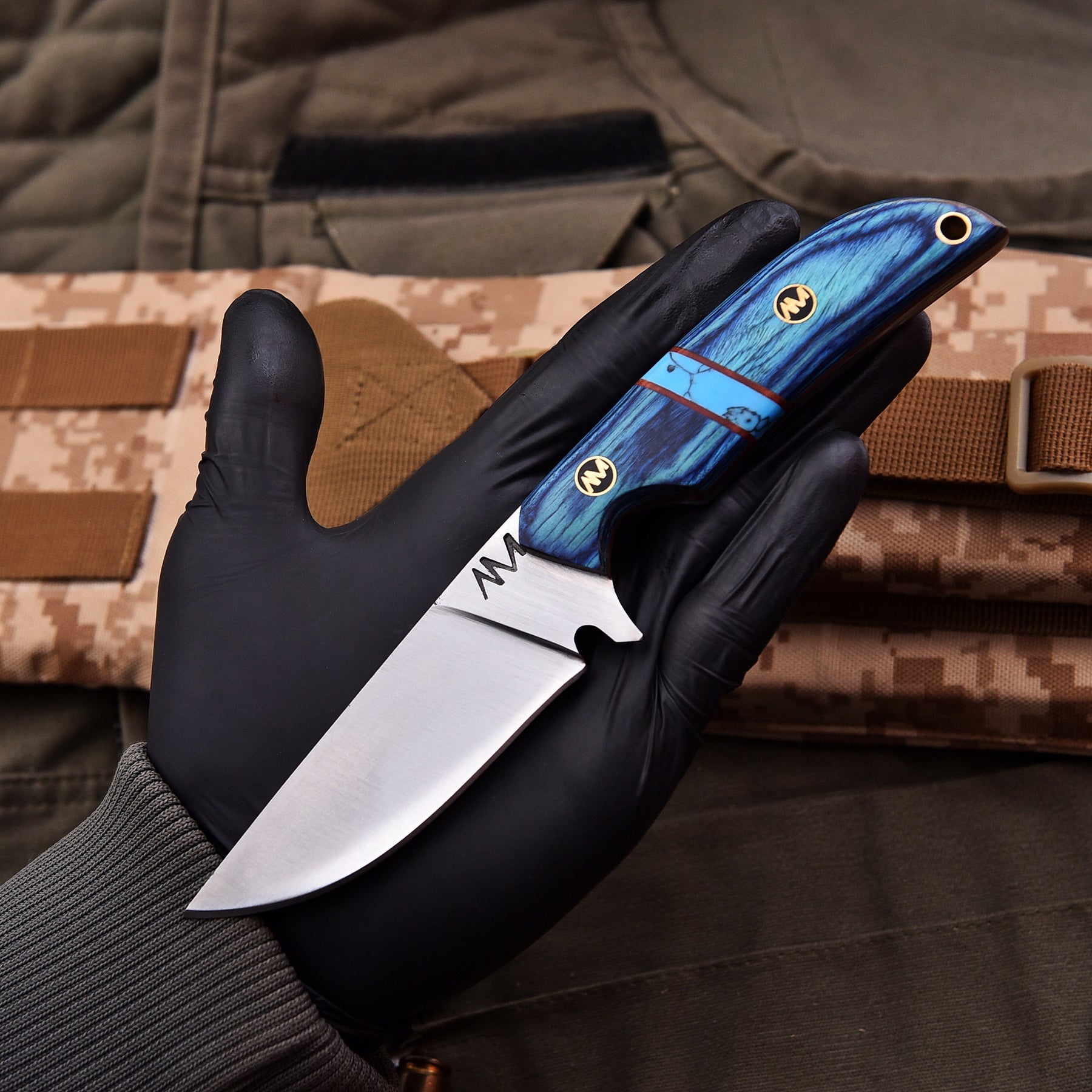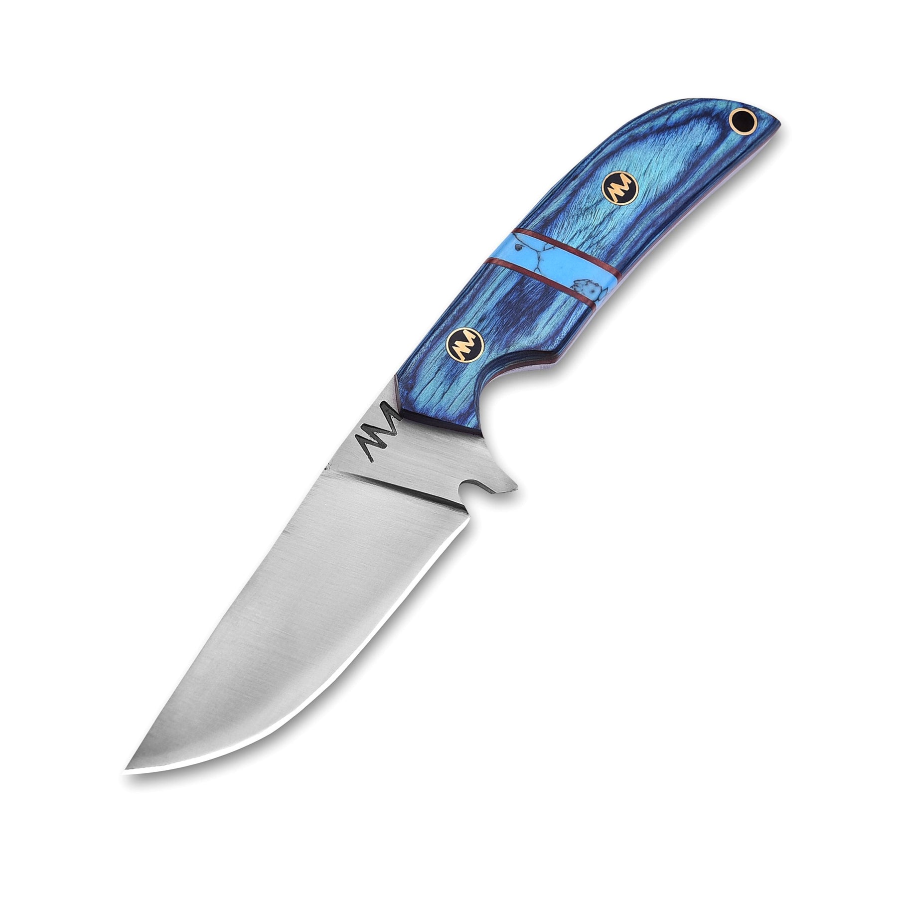 The AM Azure is a striking blend of artistry and performance, built for hunters, adventurers, and collectors who demand both function and style. Measuring 8 inches overall, this knife is forged from premium 12C27 stainless steel, ensuring long-lasting sharpness, edge retention, and corrosion resistance. The full tang construction guarantees strength and reliability, making it a dependable companion in the outdoors.
