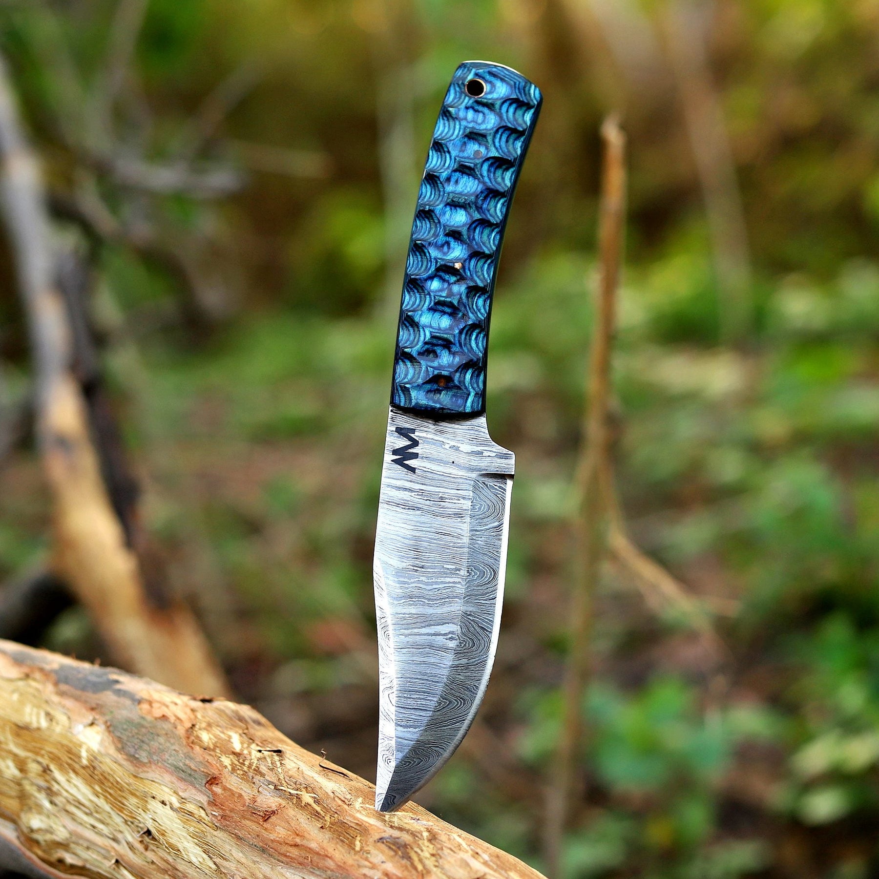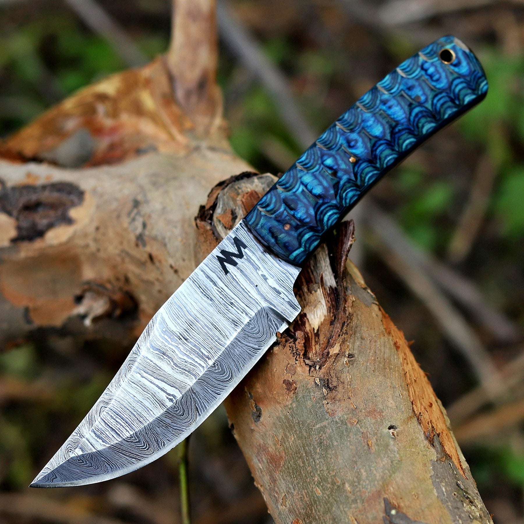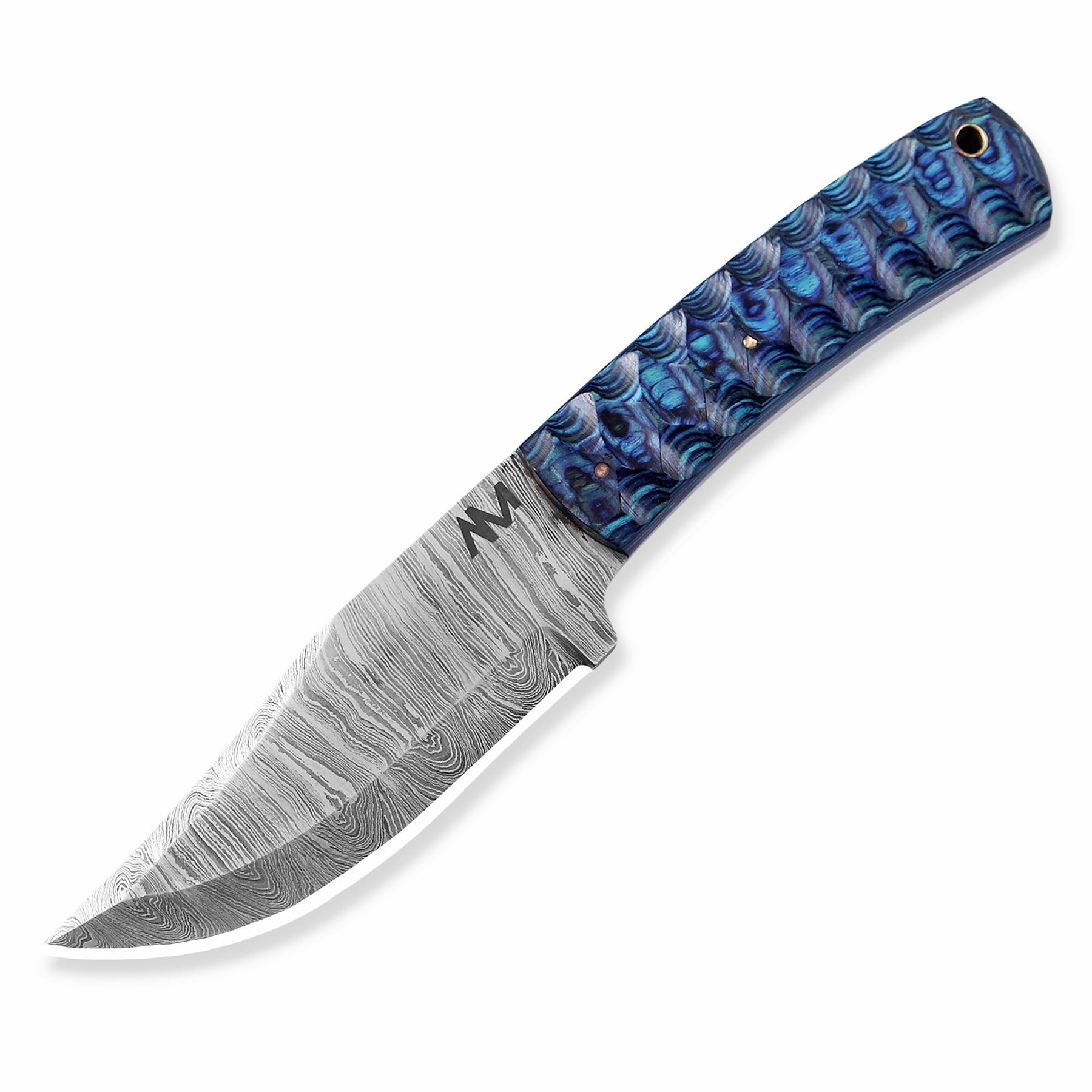 Where craftsmanship meets precision. The AM Helix is a masterfully balanced fixed blade built for those who value strength with style. Forged from layered Damascus steel and paired with a striking blue wood handle, it delivers not only a razor-sharp edge but also a design that commands attention.
