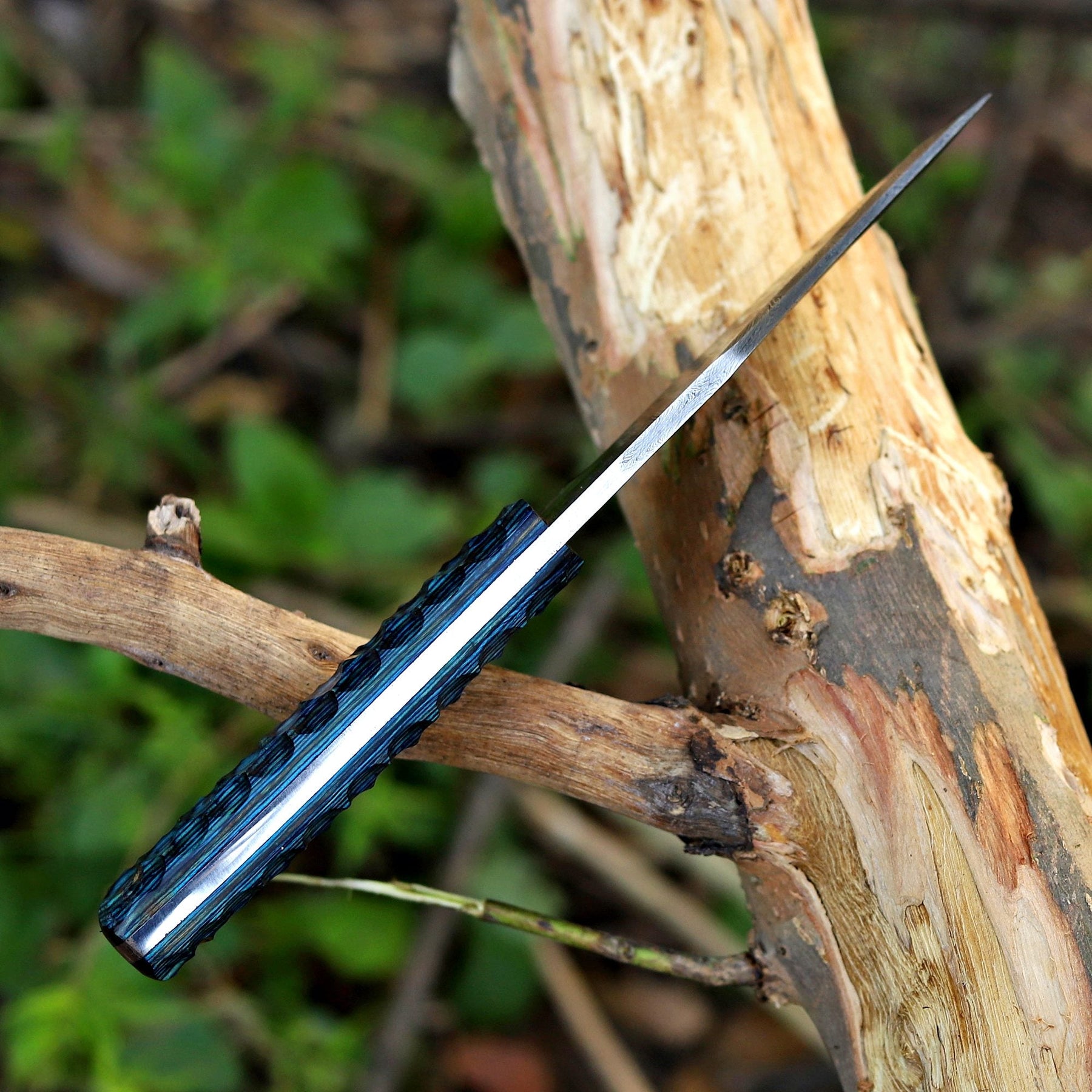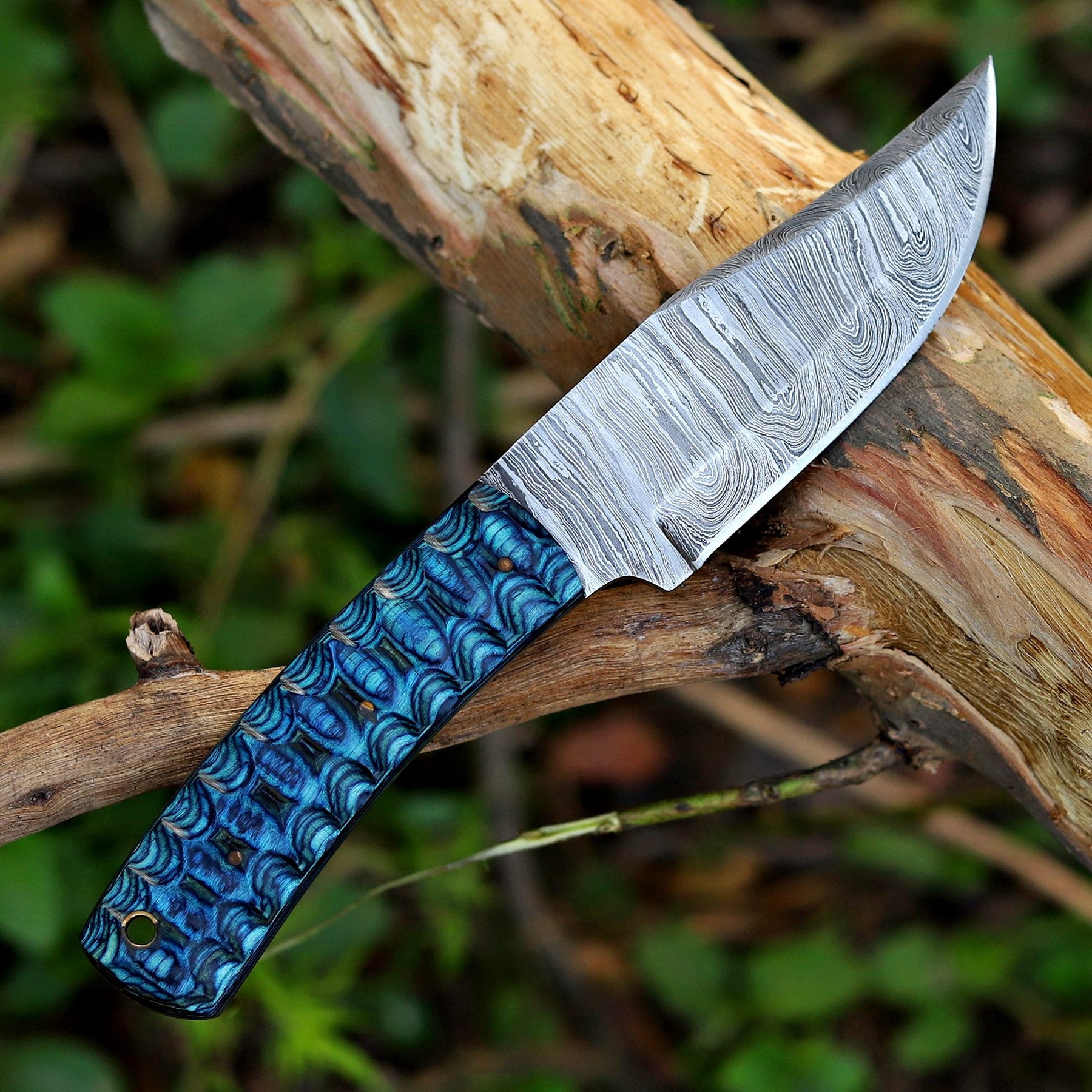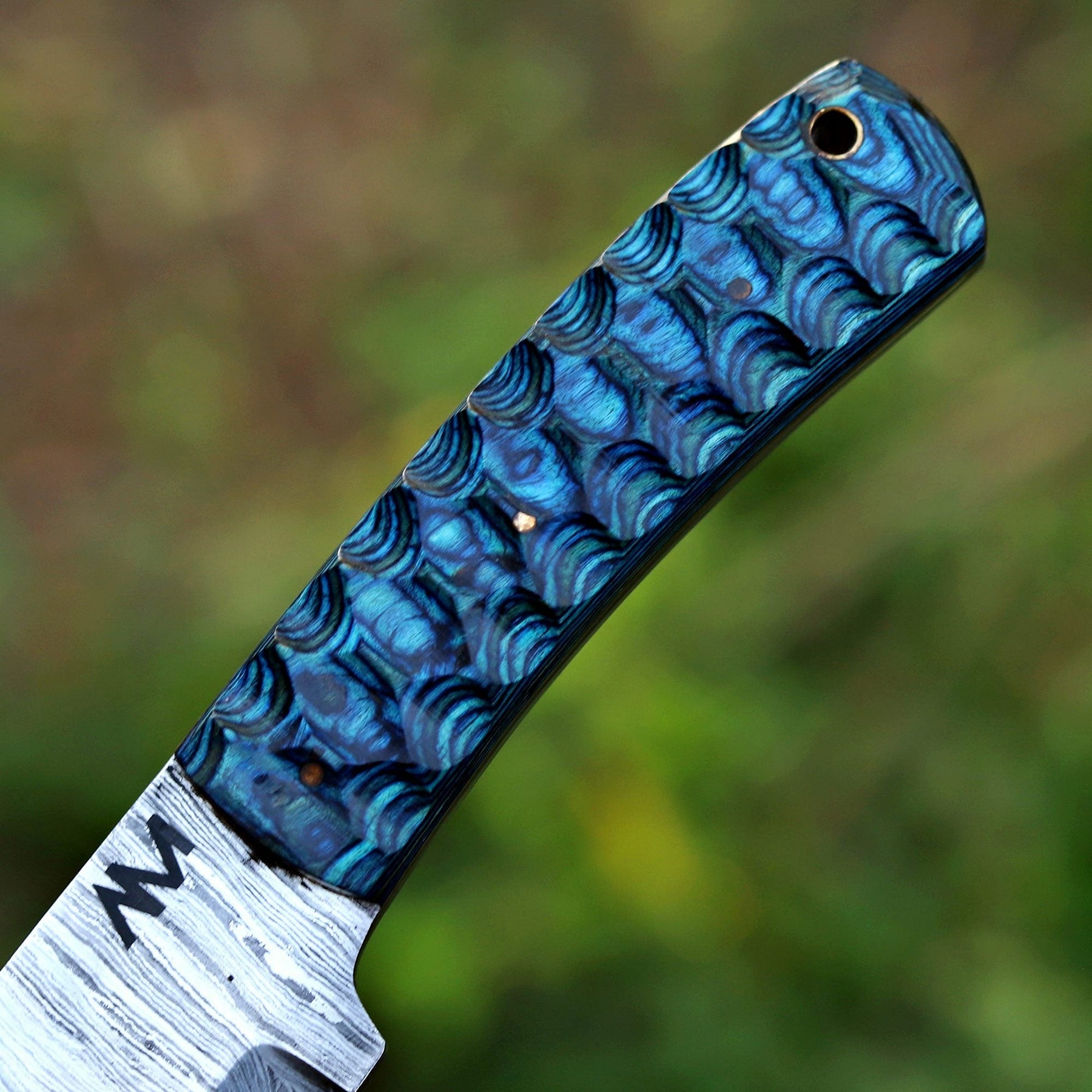 Where craftsmanship meets precision. The AM Helix is a masterfully balanced fixed blade built for those who value strength with style. Forged from layered Damascus steel and paired with a striking blue wood handle, it delivers not only a razor-sharp edge but also a design that commands attention.