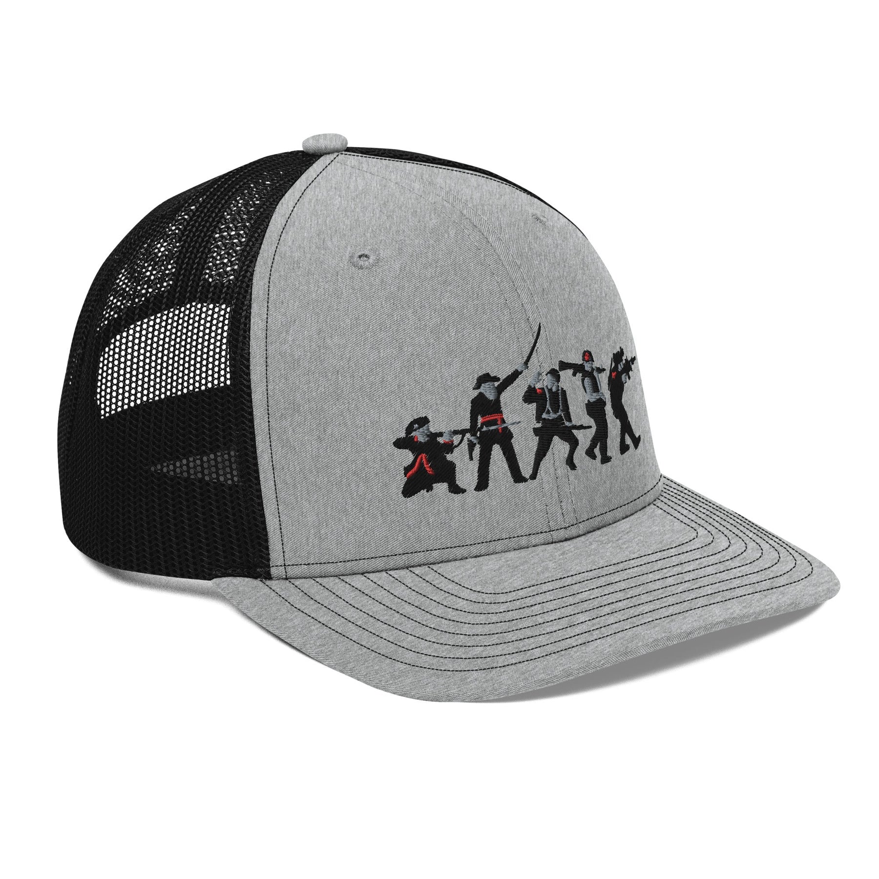 The American Bloodline Mid-Profile Trucker Cap is a tribute to the courageous soldiers who have served our country throughout its history. From the revolutionary war to modern day, this design features characters representing the brave men and women who have fought to protect our freedoms. The American Bloodline hat is a reminder of the selfless sacrifices made by these heroes, and a way to honor their bravery and service. Wear it with pride and honor the American Bloodline. It has a classic structured fit, adjustable plastic snapback, and a curved visor that matches its underbill.